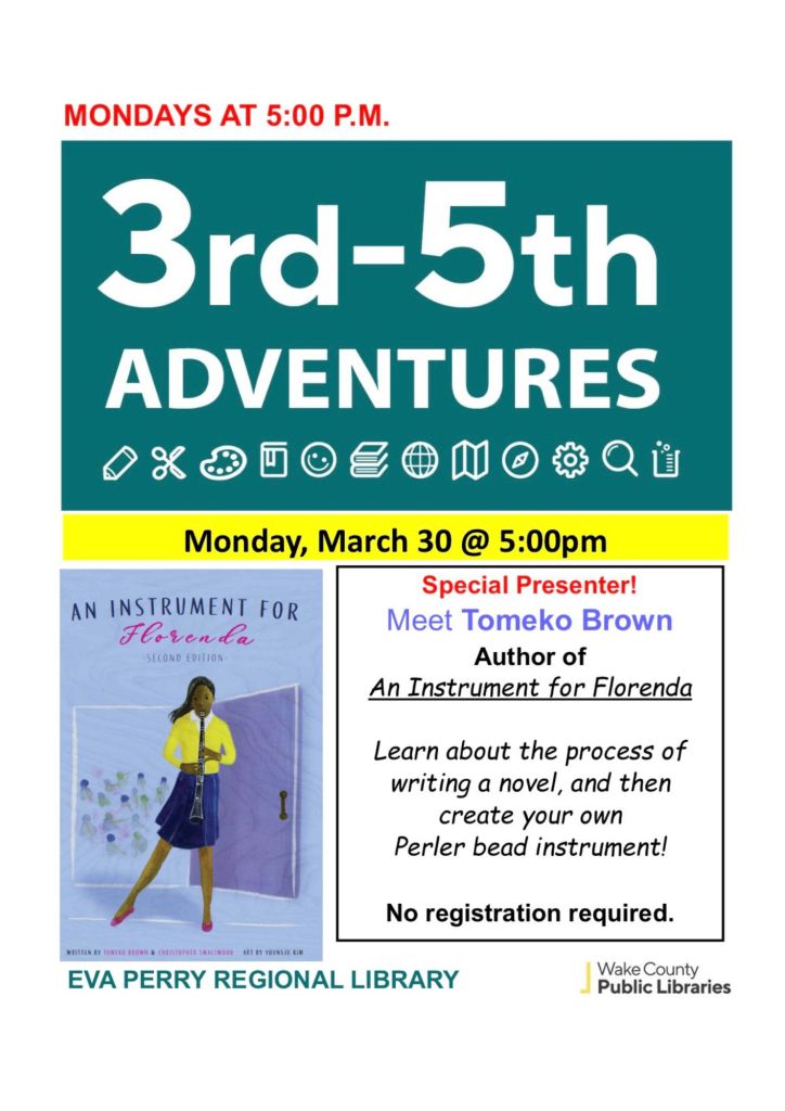 Join author Tomeko Brown for a special school-age program at Eva Perry Regional Library!